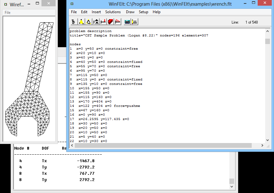 Very simple truss program. Define just nodes, constraints, elements, area and Young's modulus and node forces. | |||||||||||||||||||||||||||